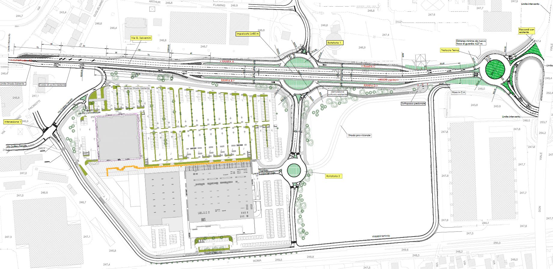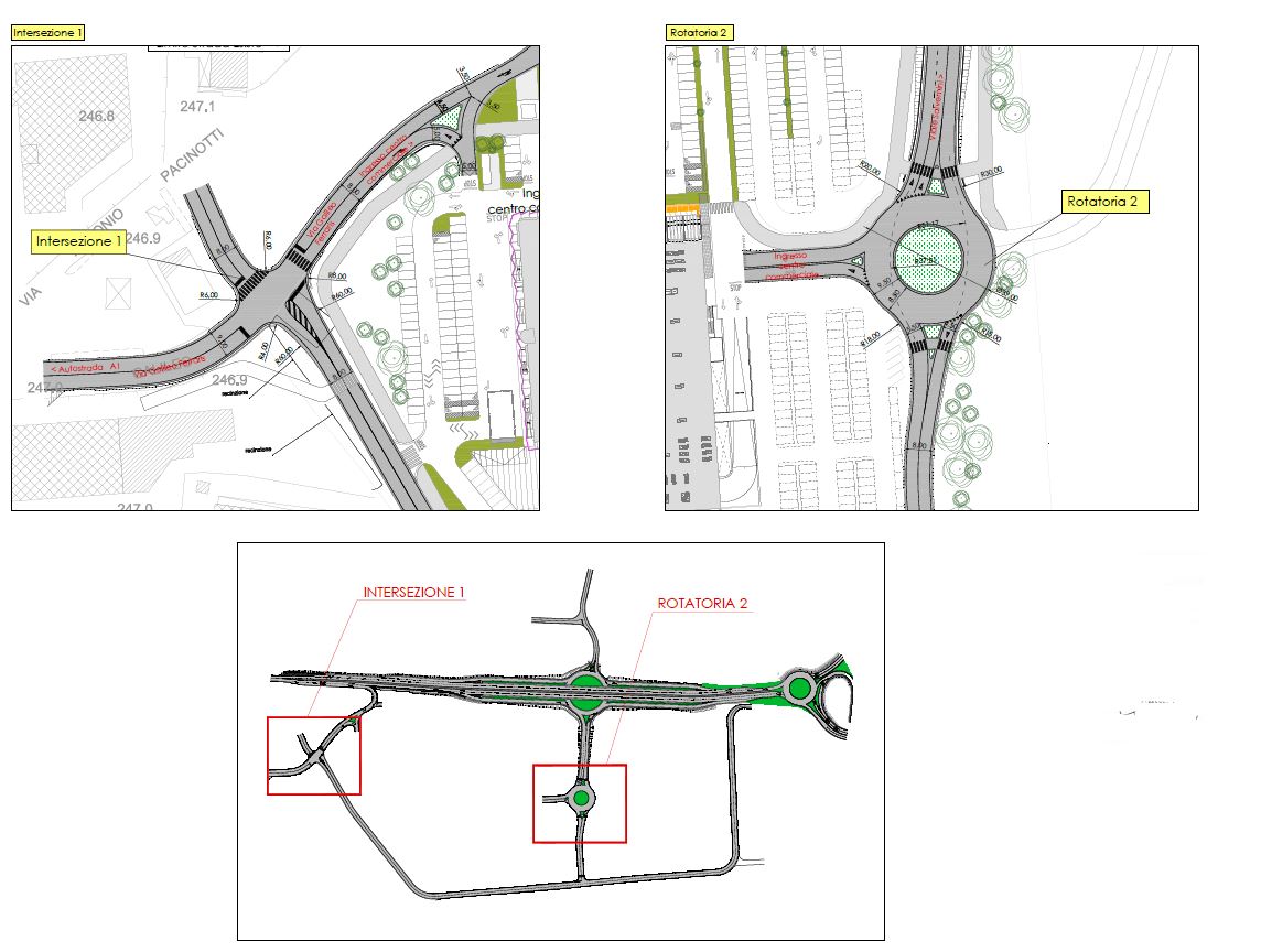 Quest’ultima strada (viabilità Ferrovia) si connette sia alla strada esistente posta ad est (area Futuria Center), sia alla esistente via Ferraris ad ovest mediante una intersezione semaforizzata.