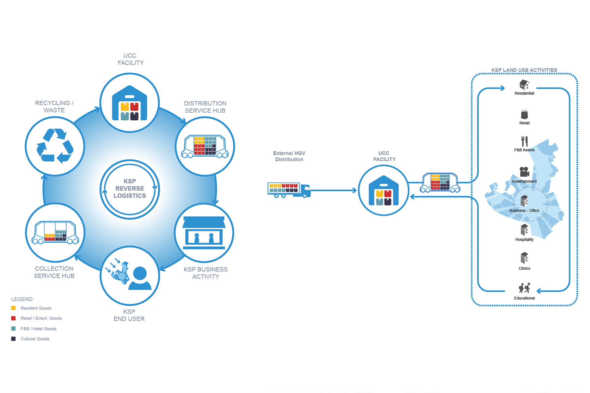 MIC-HUB ha inoltre definito delle linee guida per la logistica dell'ultimo miglio esaminando l'uso del suolo nel masterplan di KSP, al fine di fornire possibili soluzioni per la consegna delle merci e individuare ubicazioni idonee per i magazzini e il centro di consolidamento, nonché la strategia per il processo di consegna.