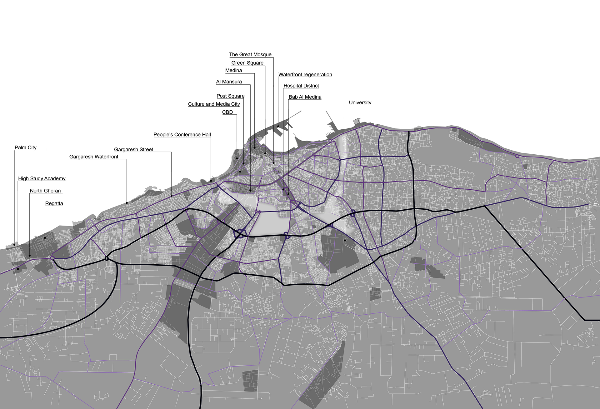 In base a una valutazione geometrica e all'orientamento principale dell'espansione urbana di Tripoli, lo studio riguardo la linea pilota ha evidenziato la necessità di seguire la direzione est-ovest per collegare il centro città con le piazze principali.