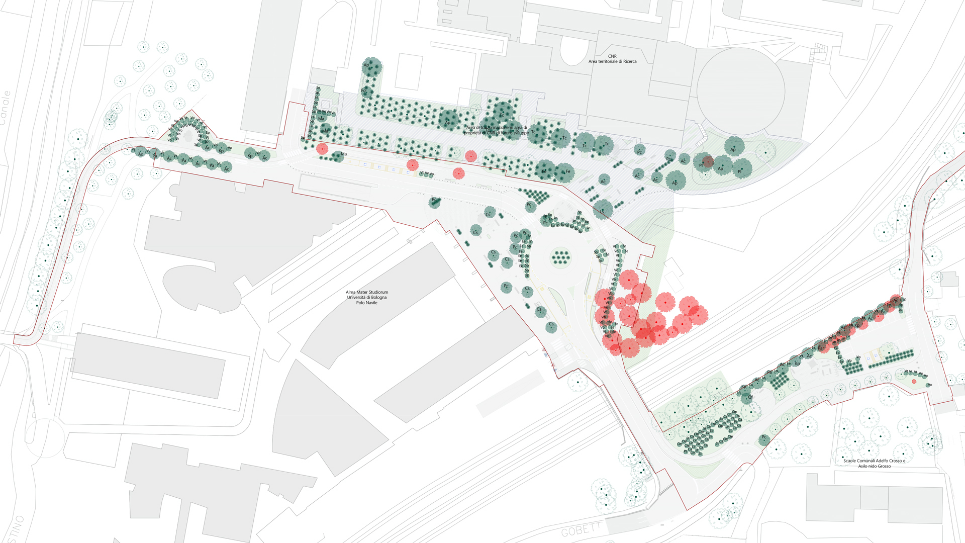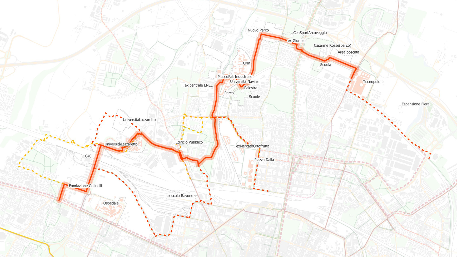 Il progetto mira a riconnettere, attraverso un percorso continuo e ben riconoscibile, il tessuto urbano esistente, mettendo a sistema gli sviluppi urbani programmati, e le vocazioni culturali, ecologiche, storiche e le esperienze della ricerca e dell’innovazione presenti nel quadrante nord-ovest della città.