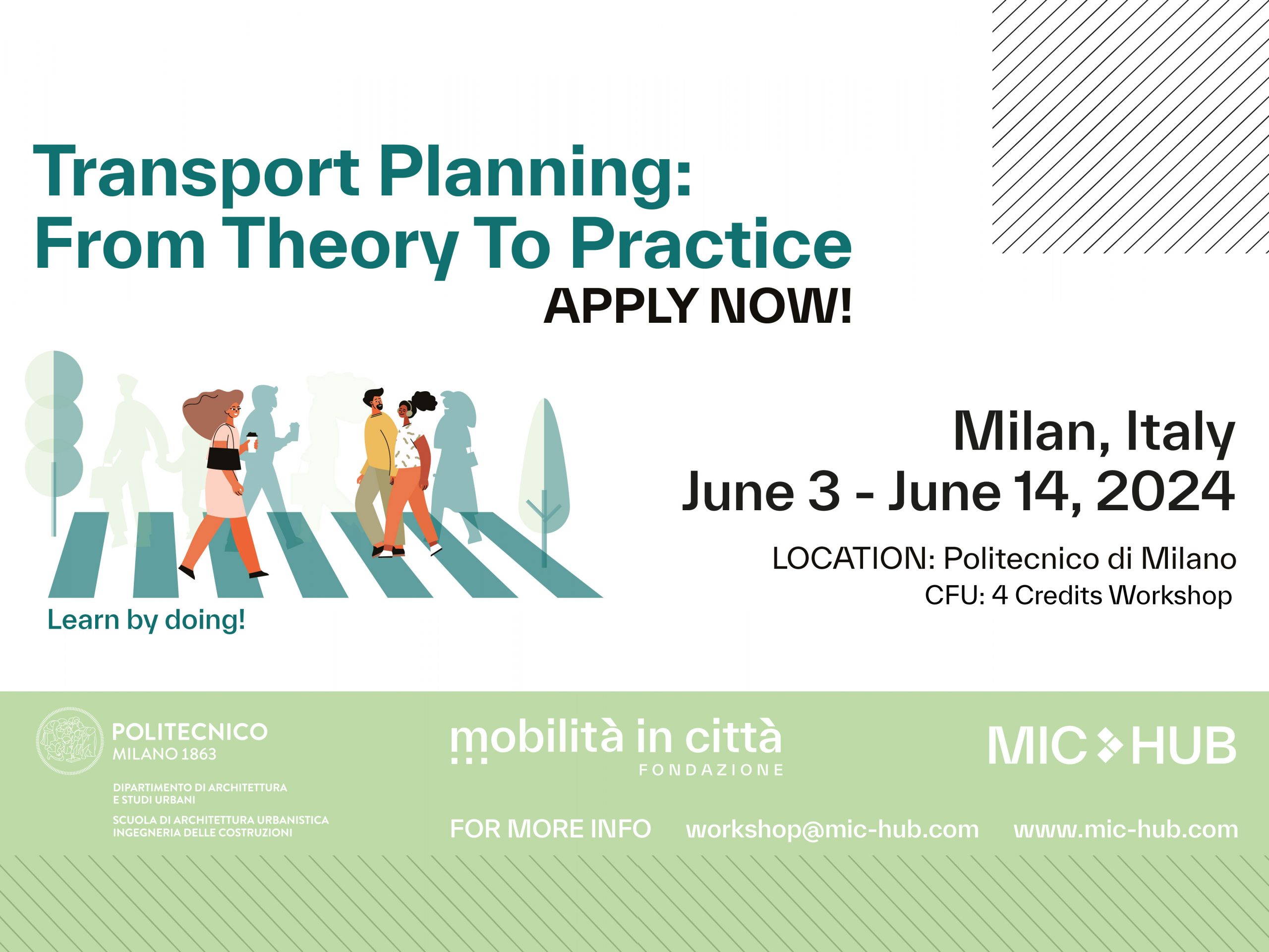 Siamo felici di presentare l’edizione 2024 di “Transport Planning: from Theory to Practice”! Il workshop è organizzato da MIC-HUB e dalla sua fondazione mobilità in città, presso il Politecnico di Milano.