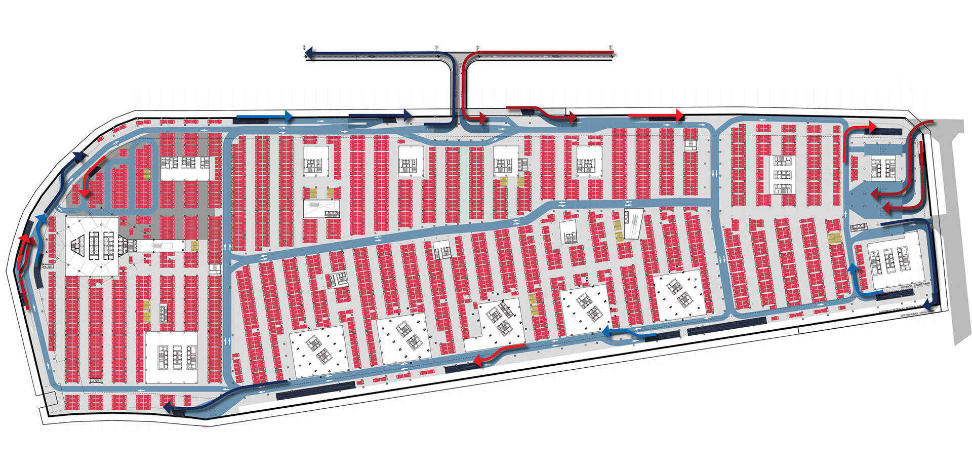 One of the most challenging aspects of the project was designing and reconfiguring the surrounding road network due to the site's physical constraints and the significant traffic demand expected from the development. Another key component of the study was defining the car park strategy and layout, which includes approximately 11,000 parking spaces to serve the various functions of the mixed-use complex.